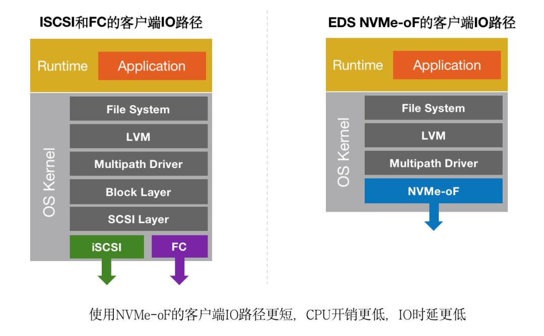 EDS通過增強支持NVMe-oF協議,來代替iSCSI和FC協議,并通過RDMA技術減少數據在客戶端內存拷貝,縮短客戶端IO路徑,降低客戶端CPU開銷。