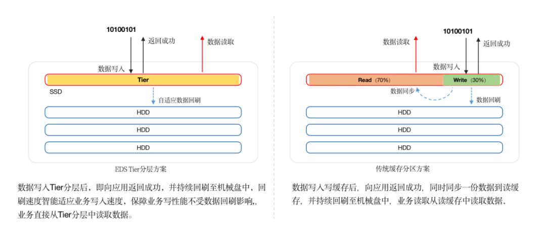 在混合盤配置下,固態盤作為高性能層提供讀寫加速能力,EDS通過獨特的Tier分層減少了數據寫入固態盤后的數據二次復制,降低固態盤壽命損耗,提高IO處理效率。
