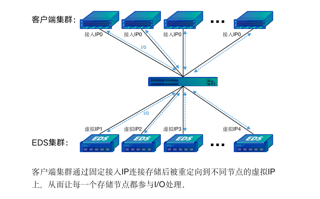 EDS通過虛擬IP池的方式實現客戶端統一IP接入,EDS服務端IO多路徑映射到存儲節點間均衡負載,每一個節點都可以參與IO接收和處理,因此EDS可以通過橫向地增加存儲節點獲得線性提升的網絡接入并發IO能力。值得一提的是,部分分布式存儲雖然存儲節點可以橫向擴展,但接入網關會限制在4個節點以內,因此接入IO并發有限。