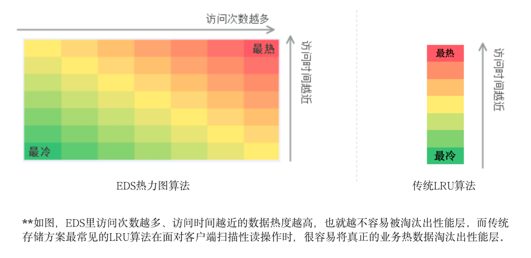 EDS的業務讀操作會優先從Tier分層讀取,所以業務讀性能跟SSD命中率強相關。由于性能層容量有限,如何把業務需要頻繁訪問的數據(即熱數據)留存在成為提升業務讀性能的關鍵。EDS通過更智能的熱力圖算法決定那部分數據留存在性能層,相比于傳統LRU算法可大幅度提升性能層命中率,提升業務讀性能。