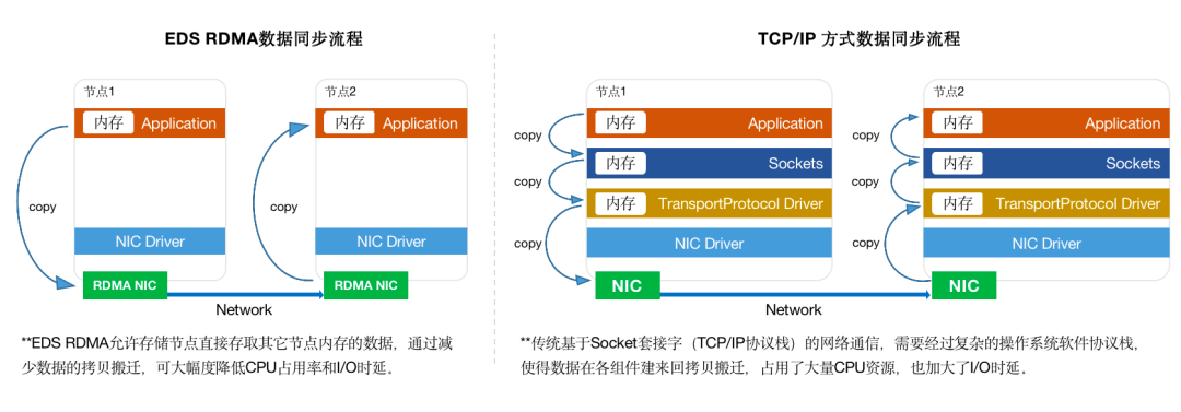 EDS的存儲網絡用來進行節點間數據同步,以多副本機制為例,由于存儲的多個副本之間要保證強一致性和數據可靠性,多個副本必須同時寫入到不同的存儲節點,因此存儲網絡時延也是影響性能的關鍵因素之一。EDS通過RDMA技術來減少內存拷貝,降低CPU消耗,從而將存儲網時延降低到10微秒以內。