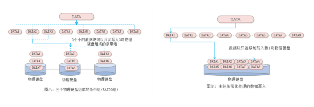 條帶化技術是指將一塊連續的數據切分成很多個小的數據塊,然后并發地存儲到不同物理硬盤上,實現對數據進行寫入或讀取時可以獲得 大程度上的I/O并發能力。