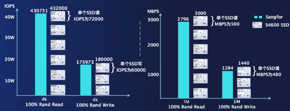 使用3節點混合盤配置的EDS集群(每節點配置2塊SATA接口固態盤作為緩存盤,6塊SATA 機械盤做數據盤)可提供43萬IOPS 性能,發揮物理硬件性能的92%以上。