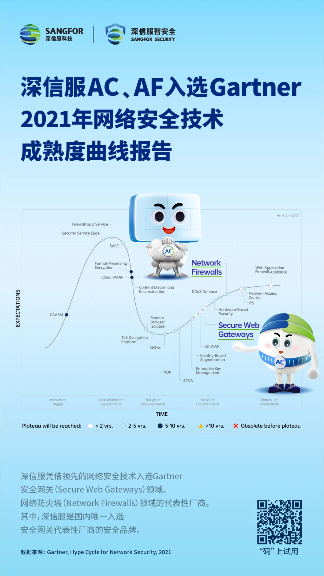 近期,全球權威咨詢分析機構Gartner發布了《2021年網絡安全技術成熟度曲線報告》(Hype Cycle for Network Security, 2021),深信服憑借的網絡安全技術,在安全網關(Secure Web Gateways,簡稱SWG)和網絡防火墻(Network Firewalls)領域被列為代表性廠商。 值得一提的是,在安全網關領域,深信服是***作為代表性廠商入選的中國安全品牌。