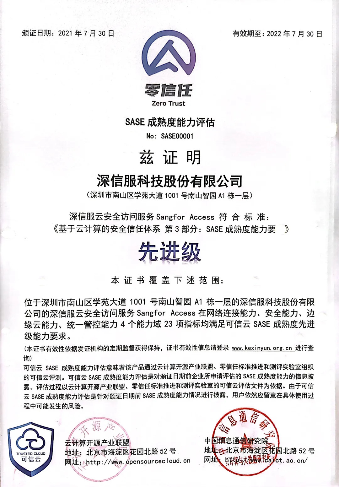 此外,本次大會(huì)公布了可信云首批零信任安全能力、SASE成熟度能力評(píng)估結(jié)果,深信服成為首批通過評(píng)估的企業(yè)之一。