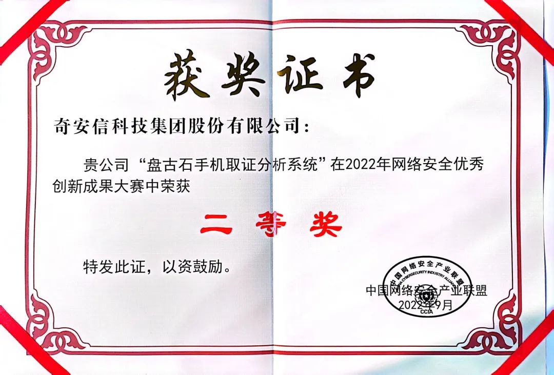 9月5日,2022網(wǎng)絡安全宣傳周重點活動——2022網(wǎng)絡安全創(chuàng)新成果大賽總決賽在京舉辦。經(jīng)過初賽、復賽、總決賽的嚴格選拔,奇安信集團“盤古石手機取證分析系統(tǒng)”獲得創(chuàng)新產品二等獎。