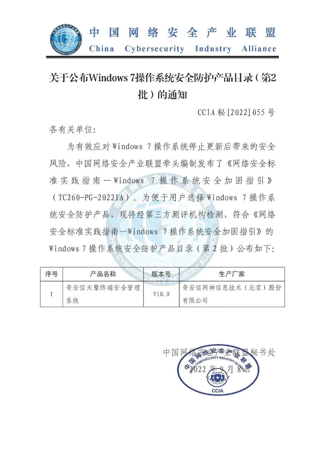 9月8日,中國網絡安全產業聯盟(CCIA)公布了第二批《實踐指南》標準的 Windows 7 操作系統安全加固防護產品目錄。經由第三方評測機構檢測,奇安信天擎終端安全管理系統入選。